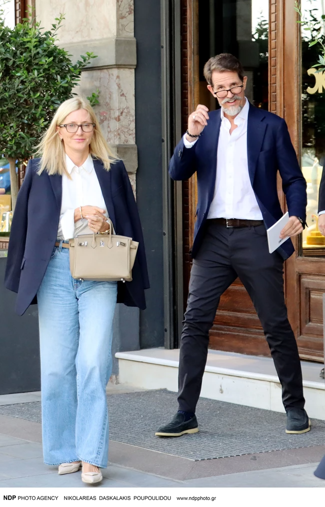 Η σύζυγος του πρίγκιπα Παύλου επέλεξε να φορέσει μία ψηλόμεση τζιν παντελόνα, με ένα κρεμ πουκάμισο με έντονο γιακά, ένα μπλε σακάκι, nude γόβες, ασορτί ζώνη, luxury τσάντα και χρυσά κοσμήματα.