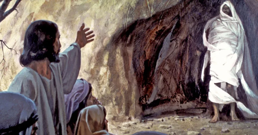 Ο Ιησούς δάκρυσε και ζήτησε να τον οδηγήσουν στον τάφο -ένα σπήλαιο φραγμένο με πέτρα βαριά. Παρότι προειδοποιήθηκε ότι, η οσμή θα ήταν ανυπόφορη, περίμενε να ανοίξει η είσοδος του τάφου και υψώνοντας φωνή μεγάλη είπε: «Λάζαρε δεύρο έξω!».