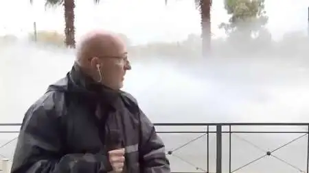 Ο γνωστός ρεπόρτερ ενώ κατέγραφε στην Ποσειδώνος τον δρόμο που γέμισε νερά, ένα τζιπ με μεγάλη ταχύτητα έριξε ένα κύμα νερού πάνω του