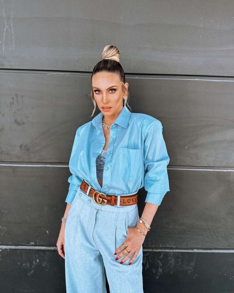 Η Αθηνά Οικονομάκου δημοσίευσε στο instagram μία φωτογραφία της, στην οποία φοράει ένα σύνολο σε baby blue χρώμα, αλλά τα βλέμματα τράβηξε η ζώνη που φορούσε.
