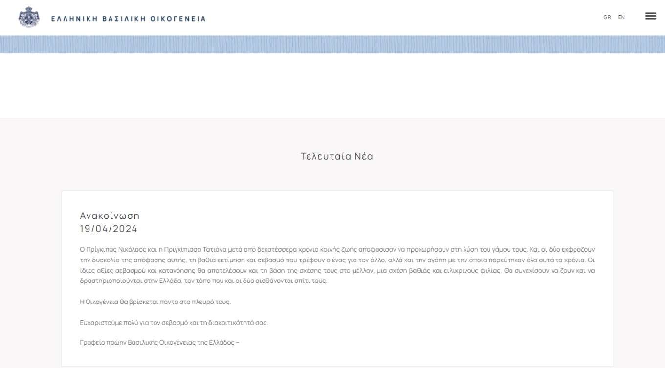 «Ο Πρίγκιπας Νικόλαος και η Πριγκίπισσα Τατιάνα μετά από δεκατέσσερα χρόνια κοινής ζωής αποφάσισαν να προχωρήσουν στη λύση του γάμου τους. Και οι δύο εκφράζουν τη δυσκολία της απόφασης αυτής, τη βαθιά εκτίμηση και σεβασμό που τρέφουν ο ένας για τον άλλο, αλλά και την αγάπη με την όποια πορεύτηκαν όλα αυτά τα χρόνια. Οι ίδιες αξίες σεβασμού και κατανόησης θα αποτελέσουν και τη βάση της σχέσης τους στο μέλλον, μια σχέση βαθιάς και ειλικρινούς φιλίας. Θα συνεχίσουν να ζουν και να δραστηριοποιούνται στην Ελλάδα, τον τόπο που και οι δύο αισθάνονται σπίτι τους.
