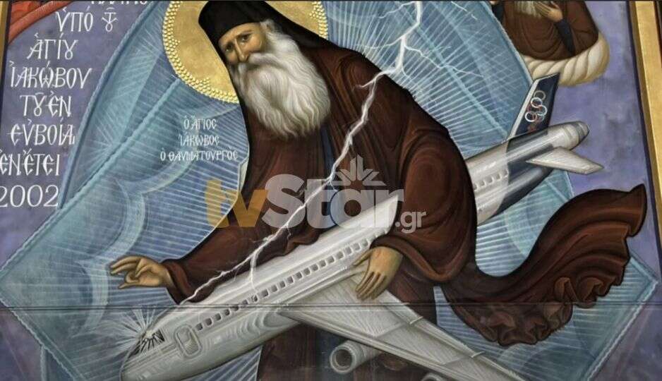 Ξαφνικά βλέπει από το δικό του παράθυρο τον Άγιο Ιάκωβο, με τα ράσα φουσκωμένα από τον αέρα, να απλώνει το χέρι του κάτω από το αεροπλάνο και να σταματά την πτώση του!