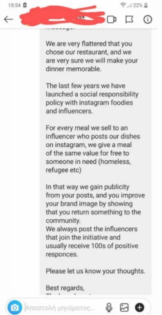 Τα τελευταία 3 χρόνια απαντάω με το παρακάτω “ευχαριστούμε πολύ, το μαγαζί έχει μια πολιτική . Κάθε instagrammer που μας επισκέπτεται τον χρεώνουμε κανονικά και προσφέρουμε δωρεάν φαγητό ίσης αξίας σε κάποιον που έχει ανάγκη. «Είναι τιμή μας που διαλέξατε το εστιατόριο μας και είμαστε σίγουροι ότι θα σας προσφέρουμε ένα αξέχαστο δείπνο. Τα τελευταία χρόνια έχουμε αναλάβει μια πολιτική κοινωνικής ευθύνης για τους foodies και τους influencers του Instagram.