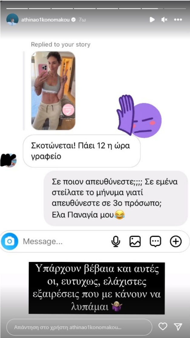 Αθηνά Οικονομάκου: Σε ποιον απευθύνεστε; Σε εμένα στείλατε το μήνυμα, γιατί απευθύνεστε σε 3ο πρόσωπο; Έλα παναγία μου