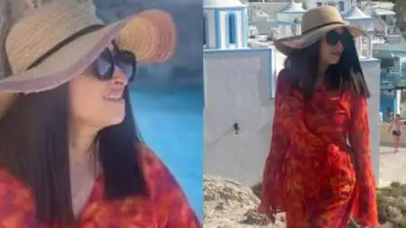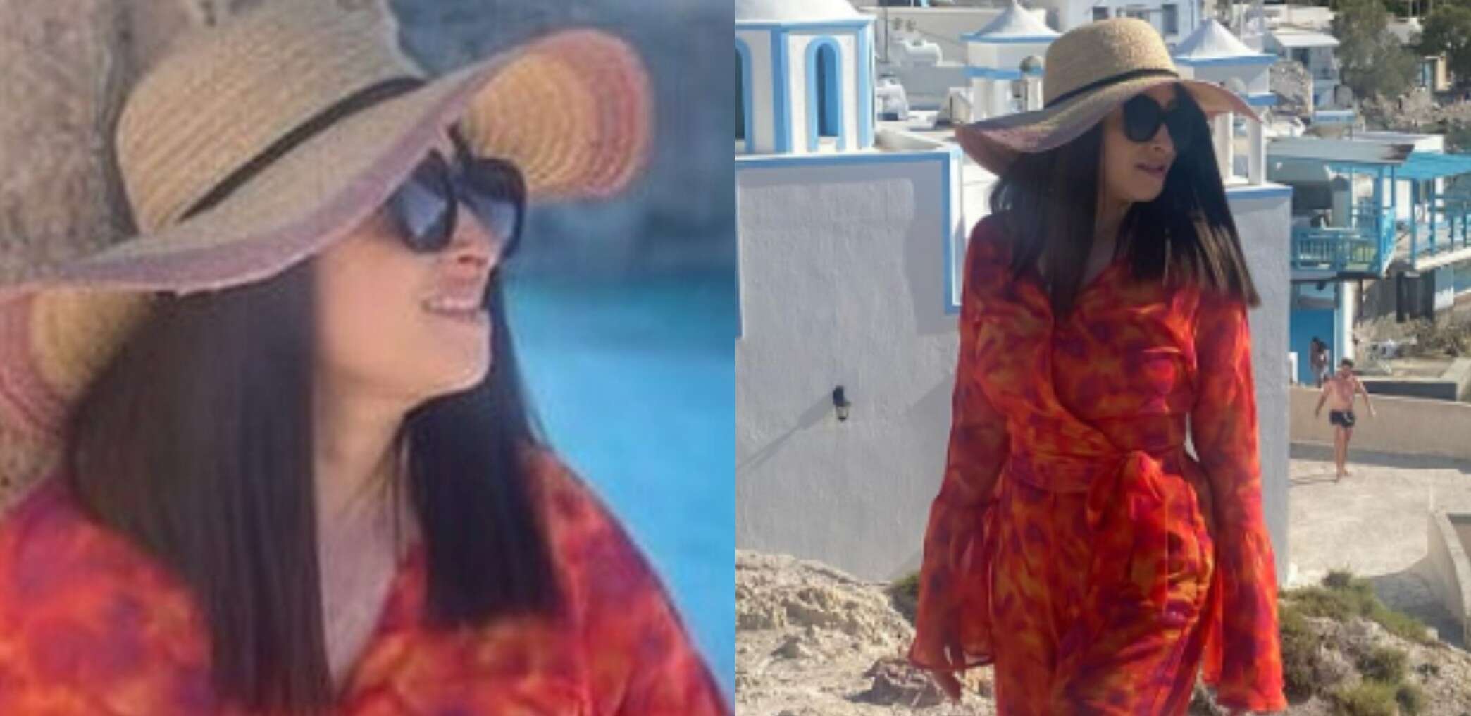 Στις φωτογραφίες η Ιωάννα Παλιοσπύρου ποζάρει φορώντας μια ολόσωμη παντελόνα στα χρώματα του κόκκινου και του πορτοκαλί και με φόντο την παραλία του νησιού.