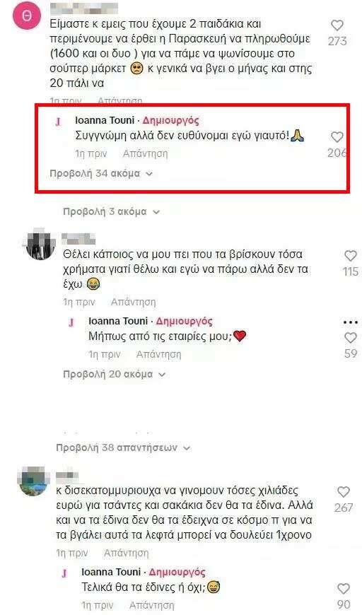 «Είμαστε και εμείς που έχουμε 2 παιδάκια και περιμένουμε να έρθει η Παρασκευή να πληρωθούμε (1600 και οι δυο ) για να πάμε να ψωνίσουμε στο σούπερ μάρκετ και γενικά να βγει ο μήνας», της έγραψε ένας χρήστη του ΤikTok με την Ιωάννα Τούνη να απαντά «Συγγνώμη αλλά δεν ευθύνομαι εγώ γι’ αυτό».