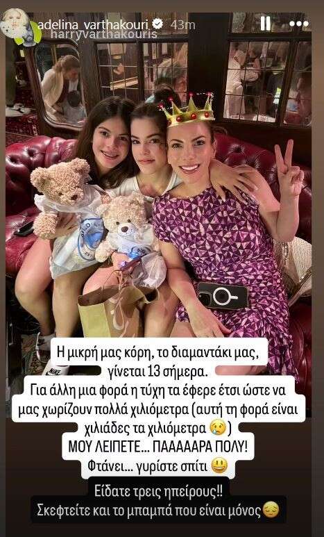 «Η μικρή μας κόρη, το διαμαντάκι μας, γίνεται 13 σήμερα. Για άλλη μία φορά η τύχη τα έφερε έτσι ώστε να μας χωρίζουν πολλά χιλιόμετρα (αυτή τη φορά είναι χιλιάδες τα χιλιόμετρα. Μου λείπετε πάααααρα πολύ. Άντε γυρίστε σπίτι.