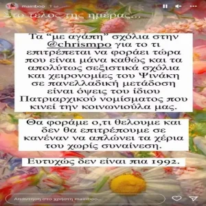Η παρουσιάστρια μέσα από ένα story της στο Instagram υπερασπίστηκε την Χριστίνα Μπόμπα ενώ έριξε τα βέλη της στον Ηλία Ψινάκη, ο οποίος στο live του X-Factor χάιδεψε το στήθος της Κατερίνας Λιόλιου, χωρίς τη συναίνεσή της.