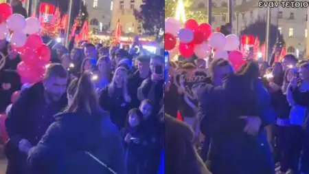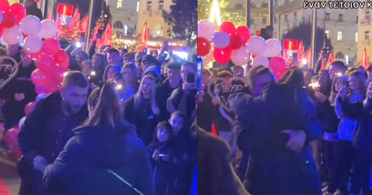 Μεγάλο θάρρος έδειξε ένας νεαρός στη Θεσσαλονίκη, ο οποίος αποφάσισε να κάνει πρόταση γάμου στην αγαπημένη του στην πλατεία Αριστοτέλους, την ώρα που γύρω του βρίσκονταν εκατοντάδες άνθρωποι.