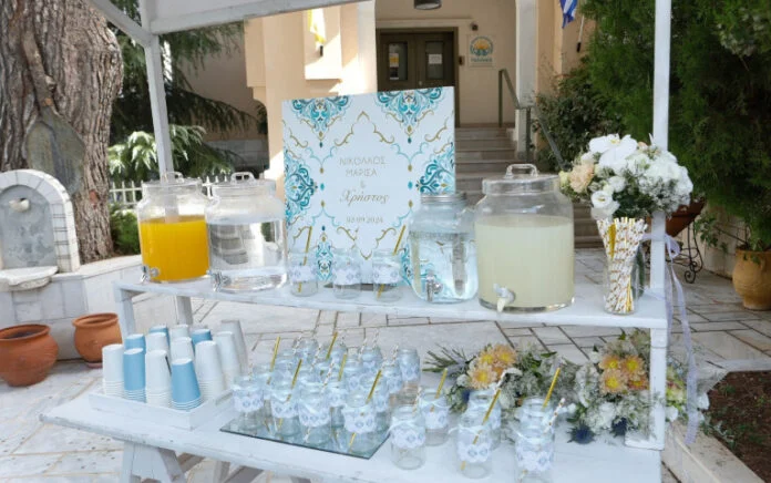 Στον προαύλιο χώρο της εκκλησίας δυο καλάθια με λουλούδια και ένα σταντ με χυμούς για τους καλεσμένους καθώς η ώρα ήταν τέτοια που είχε ζέστη και μια νότα δροσιάς ήταν απαραίτητη. Τα βαφτιστικά του μικρού Χρήστου, καθώς και τα μαρτυρικά και όλα τα απαραίτητα για τη βάπτιση, εντυπωσιακά από το ατελιέ Bridal Loft Athens της σχεδιάστριας Φαίδρας Θεοδωρίδου, επιλεγμένα με αγάπη από μαμά και γιαγιά (Η Χριστίνα Λαμπίρη μάλιστα πήγε την Πέμπτη στο ατελιέ για να τα παραλάβει καθώς η Μαρίσα και ο άντρας της δεν είχαν ακόμα έρθει από την Πάτρα που κατοικούν μόνιμα.