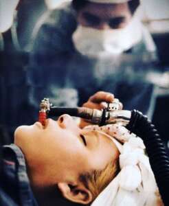 Η φωτογραφία δείχνει την Αλίκη Βουγιουκλάκη στο χειρουργικό κρεβάτι, χωρίς να έχει τις αισθήσεις της, λίγο πριν υποβληθεί στην καισαρική τομή για την γέννηση του Γιάννη.