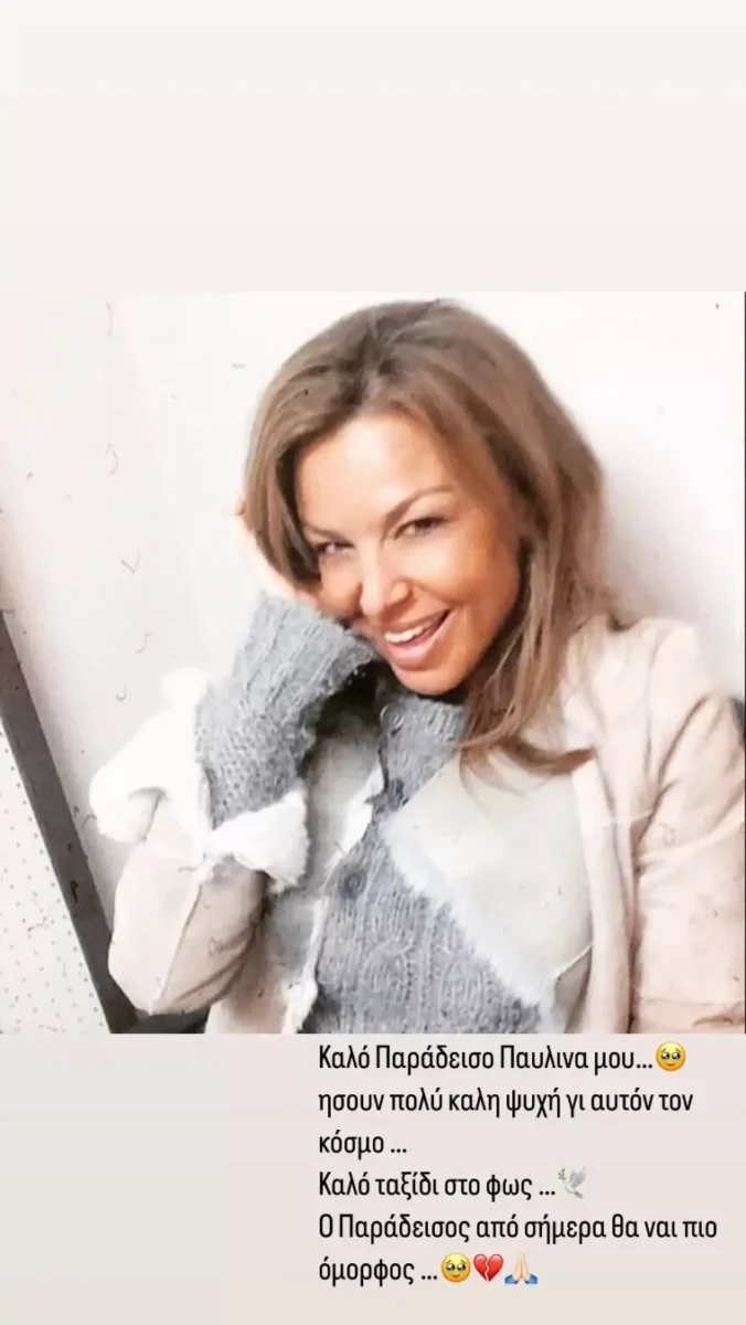 Με ανάρτησή της στα Instagram Stories της, η παρουσιάστρια έγραψε: «Καλό Παράδεισο Παυλίνα μου, ήσουν πολύ καλή ψυχή για αυτόν τον κόσμο. Καλό ταξίδι στο φως. Ο παράδεισος από σήμερα θα είναι πιο όμορφος».