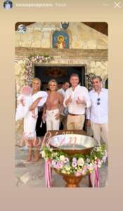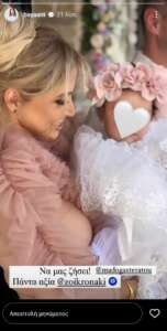 Στη βάφτιση έδωσε το παρών και η Μπάγια Αντωνοπούλου, η οποία διατηρεί στενή φιλία με τη Μαντώ Γαστεράτου. Η δημοσιογράφος του Mega ανέβασε δύο στιγμιότυπα από το χαρμόσυνο γεγονός.