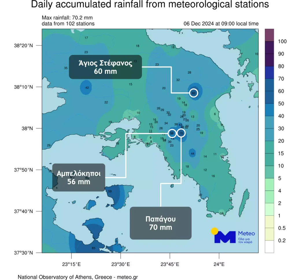 Σύμφωνα με τις καταγραφές στο δίκτυο αυτόματων μετεωρολογικών σταθμών του meteo.gr / Εθνικού Αστεροσκοπείου Αθηνών το μεγαλύτερο ύψος βροχής στην Αττική έως τις 09:00 της Παρασκευής 06/12 έχει σημειωθεί στο μετεωρολογικό σταθμό στου Παπάγου με 70 mm.