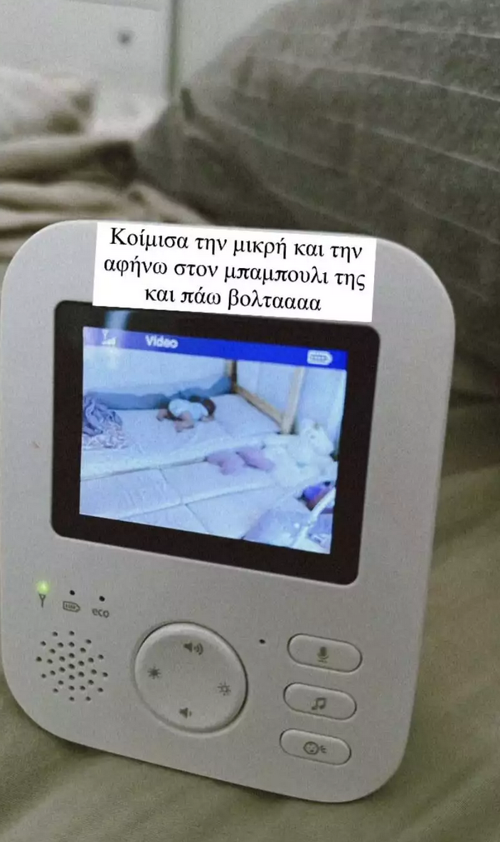«Κοίμισα την μικρή και την αφήνω στον μπαμπούλι της και πάω βόλτα», γράφει η Μαίρη Συνατσάκη, στο story της, ποστάροντας μια φωτογραφία από το μόνιτορ που παρακολουθεί την μικρή της όσο κοιμάται.