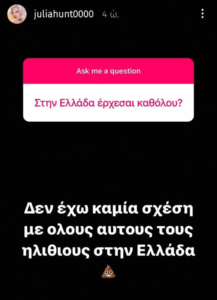 Πιο συγκεκριμένα, το μοντέλο που έχει εγκαταλείψει την Ελλάδα εδώ και χρόνια, ρωτήθηκε από έναν ακόλουθο της στο πλαίσιο ενός Q&A, αν έρχεται καθόλου στην Ελλάδα.