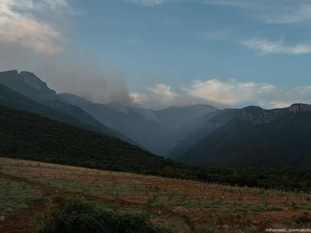 Η φωτιά καίει σε δύσβατη περιοχή, είναι έρπουσα και έχει κάνει κοιλιά μέσα στη χαράδρα μήκους περίπου 3 χιλιομέτρων. Η εν λόγω χαράδρα εκτείνεται νοτιότερα της χαράδρας του Ενιπέα.