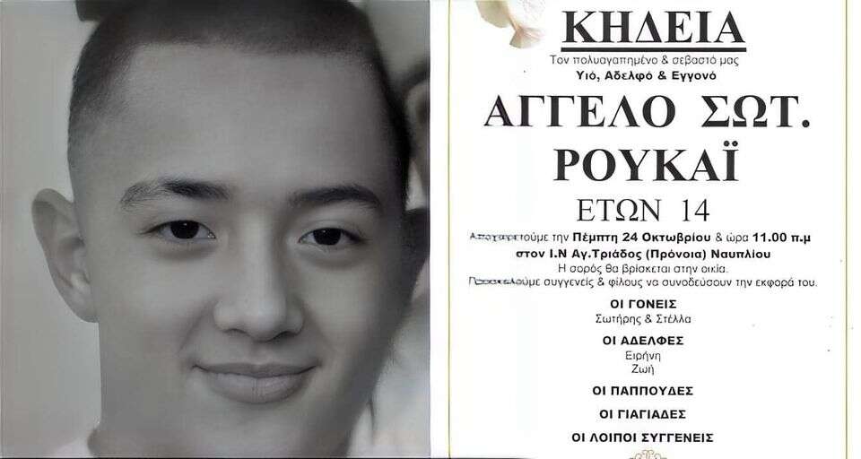 Τον πολυαγαπημένο & σεβαστό μας Υιό , Αδελφό & Εγγονό ΑΓΓΕΛΟ ΣΩΤ. ΡΟΥΚΑΪ ετών 14 αποχαιρετούμε: