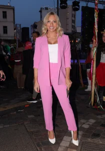 Η Ιωάννα Μαλέσκου έχοντας τον ρόλο της παρουσιάστριας επέλεξε ένα ροζ κοστούμι το οποίο συνδύασε με λευκό top και λευκές γόβες συμμετέχοντας και εκείνη στο παιχνίδι των χρωμάτων που επέβαλε η ημέρα, αλλά και της άνοιξης.