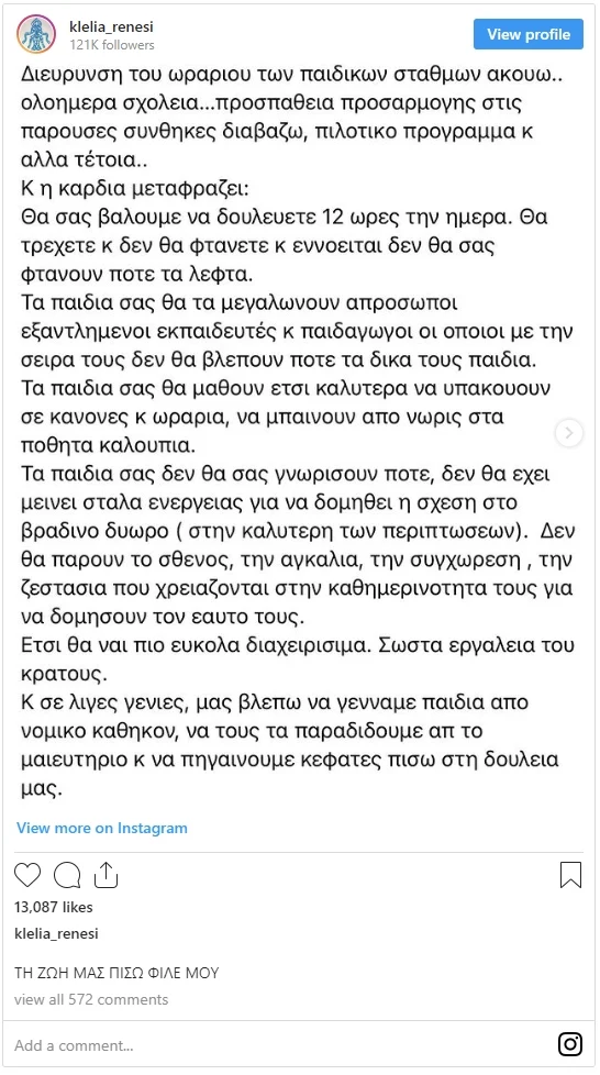 Η Κλέλια Ρένεση στην ανάρτησή της στο Instagram προσθέτει πως με το διευρυμένο ωράριο των σχολείων οι γονείς θα δουλεύουν 12ωρα και δεν θα δομηθεί η γονική καταλήγοντας πως και έτσι τα παιδιά «θα ‘ναι πιο εύκολα διαχειρίσιμα».
