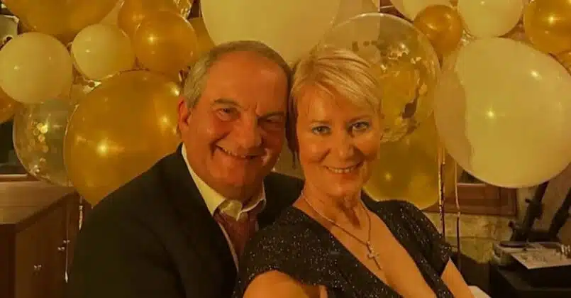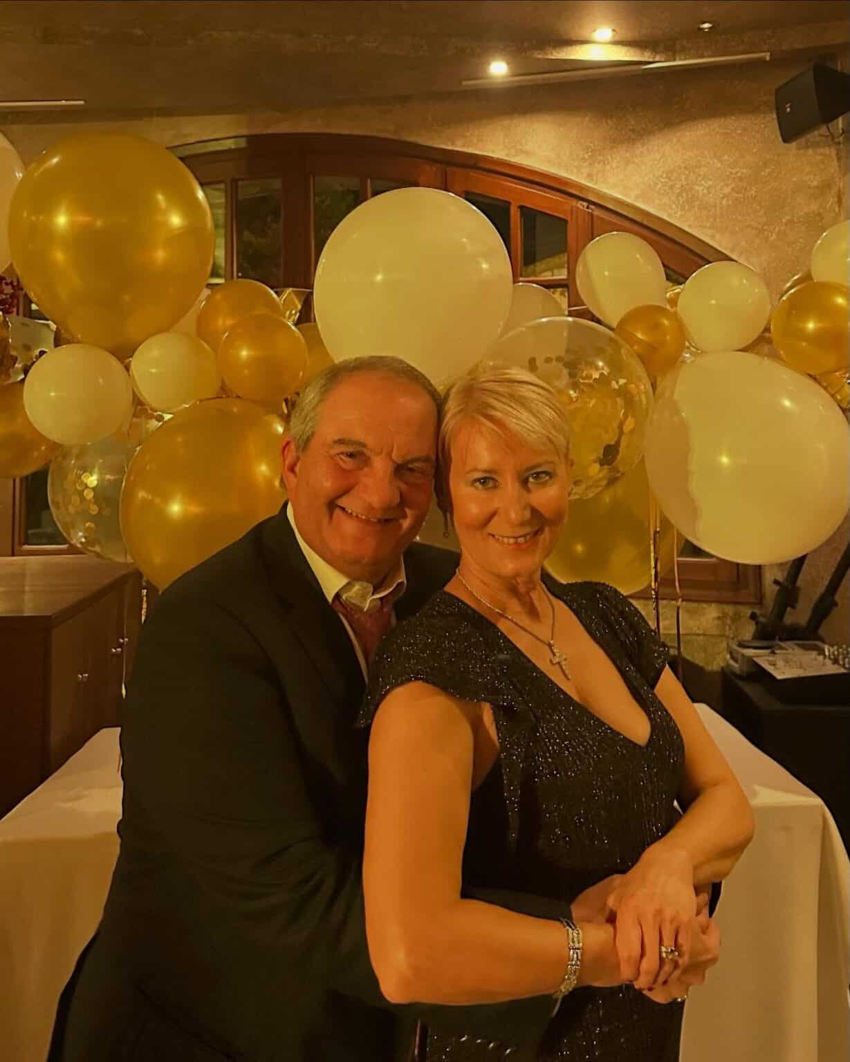 Με εντυπωσιακό glam φόρεμα, η Νατάσα Παζαΐτη και με φόντο χρυσαφί μπαλόνια, ποζάρει στην αγκαλιά του συζύγου της Κώστα Καραμανλή, με τους δυο τους να χαμογελούν ευτυχισμένοι στον φακό.