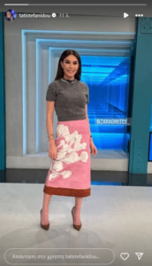 Στην εκπομπή «T- live,» η Τατιάνα Στεφανίδου πραγματοποίησε μια τολμηρή επιλογή στην ενδυμασία της. Η γνωστή δημοσιογράφος επέλεξε να φορέσει μια μίντι ροζ φούστα από τη συλλογή των Zara για τη νέα σεζόν, συνδυαζόμενη με καφέ δερμάτινες γόβες και ένα γκρι κοντομάνικο jumper με κεντημένες πέρλε.