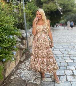 Η παρουσιάστρια επέλεξε να φορέσει ένα εμπριμέ φόρεμα με βάση το εκρού, το οποίο έχει σχέδια, σε pastel χρωματικούς τόνους του ροζ και του πράσινου, εμφανίστηκε στην εκκλησία. Το εν λόγω φόρεμα είναι από την εταιρία Zimmermann και η τιμή του ανέρχεται πάνω από 1.000 €.