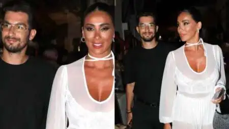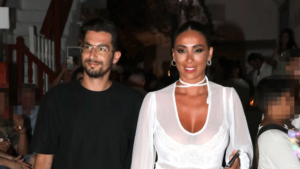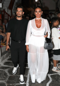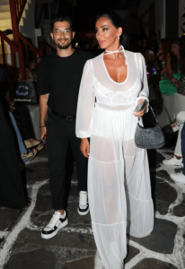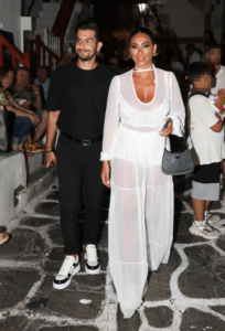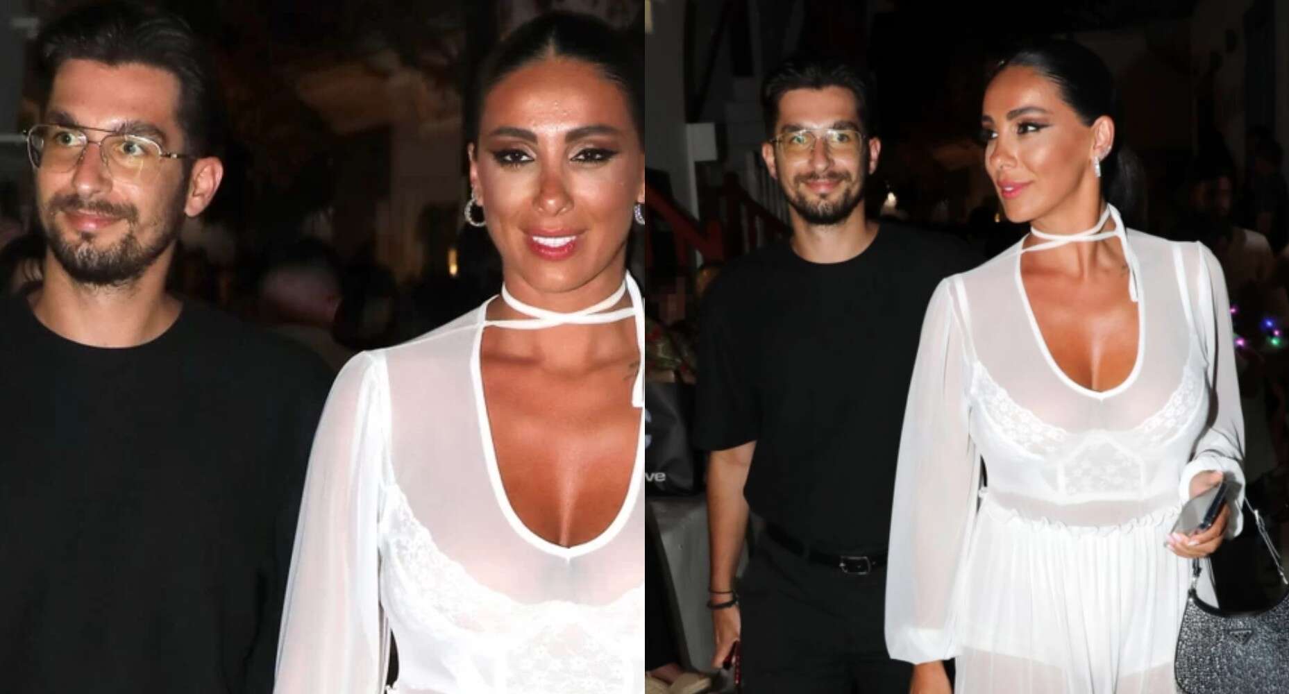 Το ζευγάρι επέλεξε να κάνει την πρώτη επίσημη κοινή εμφάνιση στα Ματογιάννια στη Μύκονο. Η Βαλέρια Χοψονίδου επέλεξε για τη βόλτα της ένα διάφανο λευκό σετ σε μάξι μήκος.