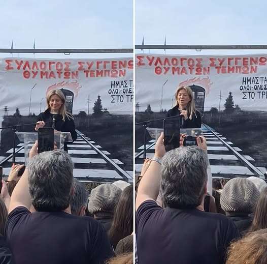 Η Μαρία Καρυστιανού, που έχασε την 19χρονη κόρη της στα Τέμπη, κρατά πλακάτ με την φράση «δεν έχω οξυγόνο».