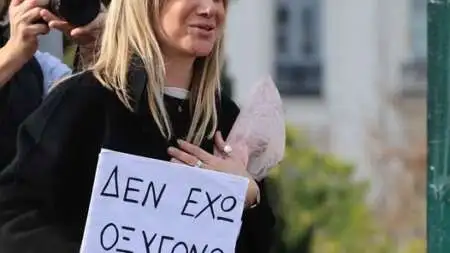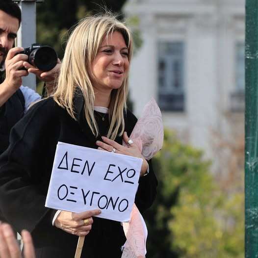 Η Μαρία Καρυστιανού, που έχασε την 19χρονη κόρη της στα Τέμπη, κρατά πλακάτ με την φράση «δεν έχω οξυγόνο».