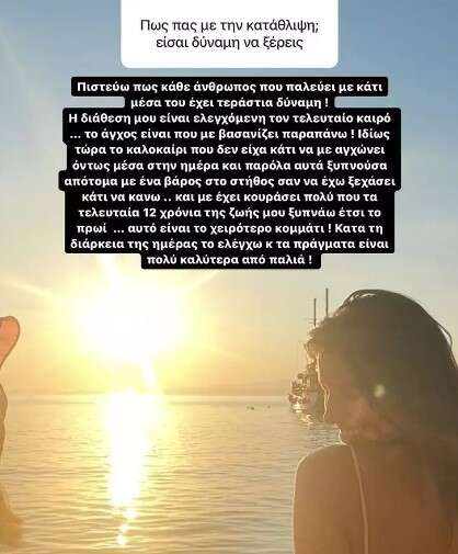 «Πιστεύω πως κάθε άνθρωπος που παλεύει με κάτι μέσα του έχει τεράστια δύναμη! Η διάθεσή μου είναι ελεγχόμενη τον τελευταίο καιρό… το άγχος είναι που με βασανίζει παραπάνω! Ιδίως τώρα το καλοκαίρι που δεν είχα κάτι να με αγχώνει όντως μέσα στην ημέρα και παρόλα αυτά ξυπνούσα απότομα με ένα βάρος στο στήθος σαν να έχω ξεχάσει κάτι να κάνω…