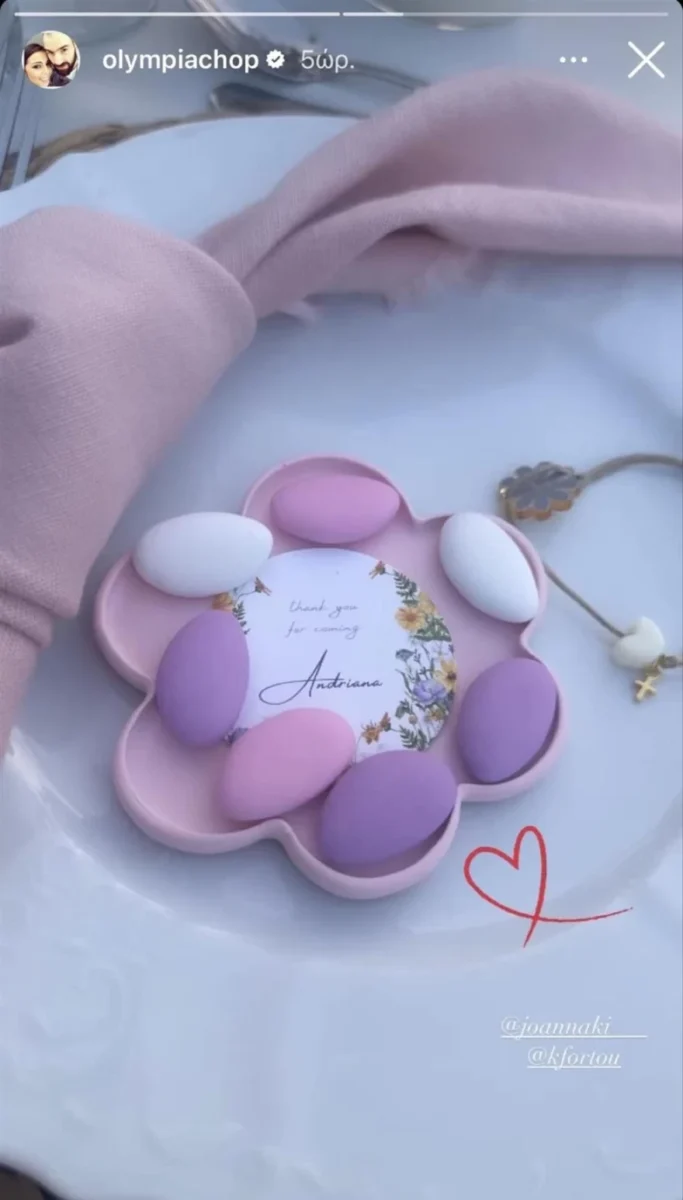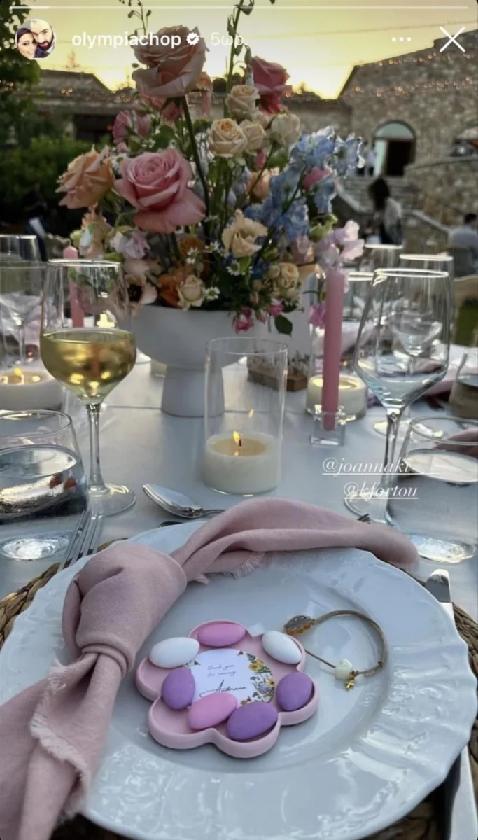 Ένα ροζ πιατάκι σε σχήμα λουλουδιού, με ροζ και μωβ κουφέτα, αλλά και ένα ευχαριστήριο γράμμα. Τις εντυπώσεις έκλεψε και η διώροφη τούρτα που είχε πάνω επίσης άνθη.