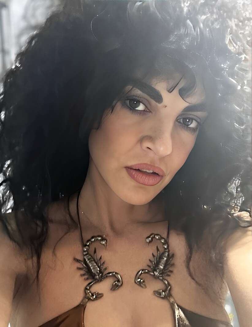 Στα 50 της, η ηθοποιός πόζαρε φορώντας ένα λαμέ μάξι φόρεμα, το οποίο ξεχώρισε για το βαθύ ντεκολτέ και τις ιδιαίτερες λεπτομέρειες με σκορπιούς στο πάνω μέρος.