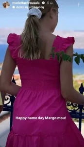 Η παρουσιάστρια και επιχειρηματίας με αφορμή την γιορτή της Παναγιάς θέλησε να ευχηθεί στην 11χρονη κόρη της, Μαργκώ. Στη φωτογραφία βλέπουμε τη μικρή να είναι πλάτη και να φοράει ένα ροζ φόρεμα και τα μαλλιά της τα είχε πιασμένα σε αλογοουρά.