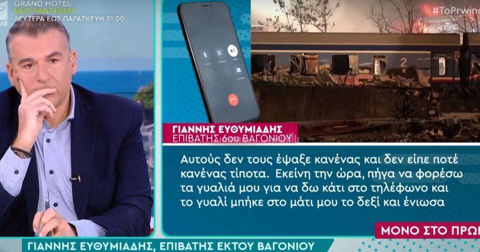 Ο Γιάννης Ευθυμιάδης, επιβάτης του έκτου βαγονιού στο μοιραίο τρένο στα Τέμπη, μίλησε στην εκπομπή “Πρωινό”, σήμερα, Πέμπτη, το πρωί και περιέγραψε με λεπτομέρειες τη στιγμή της σύγκρουσης, ενώ έκανε και μια σημαντική αποκάλυψη για το βαγόνι δύο.