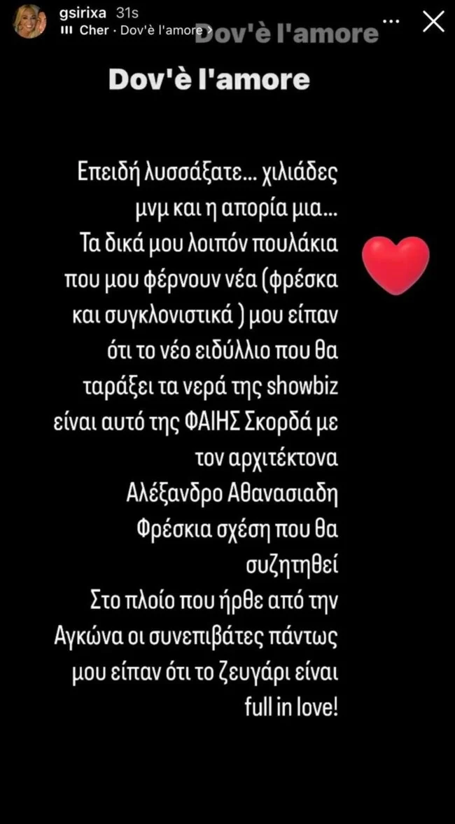 Και εκεί που όλοι πίστευαν ότι έχει έρθει πολύ κοντά με τον επιχειρηματία Γιώργο Μπαρμπαλιά, η «Espresso», μάλιστα, τους είχε πετύχει μαζί στο αεροδρόμιο «Ελευθέριος Βενιζέλος» να περιμένουν πτήση της Aegean με προορισμό τη Μύκονο, όπου οι δυο τους τα πέρασαν μούρλια με τους Μαρίνα Βερνίκου, Χριστίνα Πολίτη και Γιώργο Μαζωνάκη, έσκασε μια ανάρτηση της συναδέλφου Τζώρτζιας Συρίχα στον προσωπικό της λογαριασμό στο Instagram, όπου αποκάλυπτε ότι ο αρχιτέκτονας Αλέξανδρος Αθανασιάδης είναι ο νέος σύντροφος της Φαίης Σκορδά.