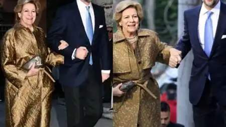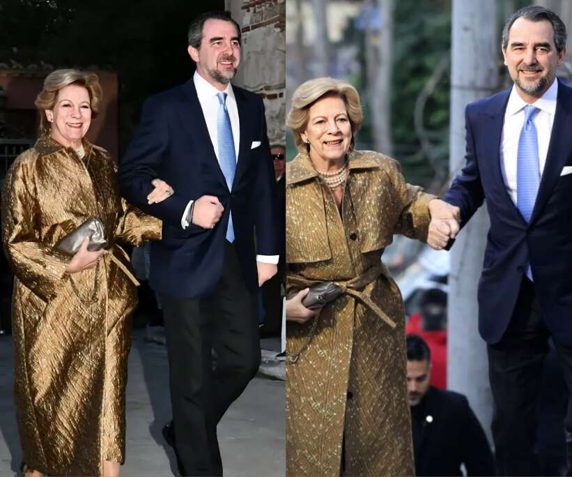 Η σύζυγος του τέως βασιλιά Κωνσταντίνου παρέμεινε πιστή στην αγαπημένη της Max Mara, επιλέγοντας ένα χρυσό πανωφόρι σε στυλ καμπαρντίνας.