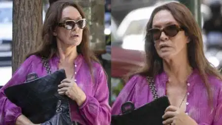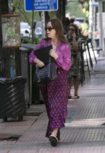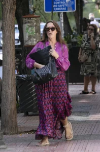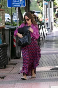 H γνωστή ηθοποιός περπάτησε στους δρόμους του Κολωνακίου φορώντας μια μακριά φούστα με σχέδια, την οποία συνδύασε με μοβ πουκάμισο και μπεζ φλατ σανδάλια. To casual look της συνδύασε με μαύρη τσάντα του οίκου Chanel.