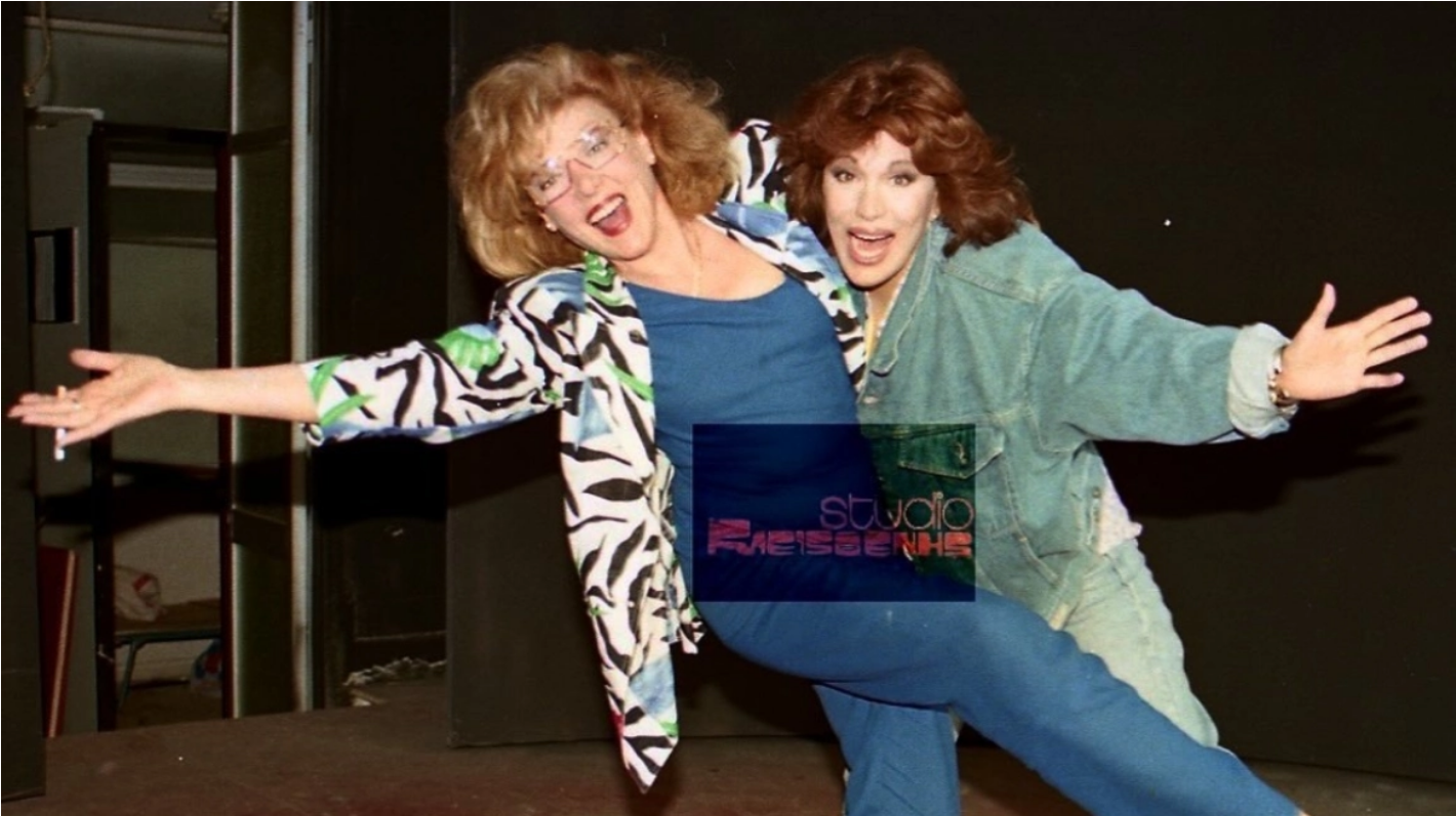 «Ο Κλεισθένης φωτογραφίζει την Μάρω Κοντού και τη Μαίρη Χρονοπούλου στις πρόβες στο Δελφινάριο για την παράσταση “Μωρά μου καλησπέρα βογγάμε όλη μέρα” το 1992. Μαζί με τους Στάθη Ψάλτη, Θανάση Βέγγο, Τζέσυ Παπουτσή, Μάρκο Λεζέ, Νικο Παπαναστασίου, Γιώργο Βασιλείου κ.α. Ήταν η μια από τις τρείς φορές που έπαιξαν μαζί στο θέατρο,οι άλλες δύο ήταν στις παραστάσεις του εθνικού θεάτρου στο αρχαίο θέατρο της Επιδαύρου το 1955 “Οιδίπους τύραννος” και το 1956 “Μήδεια” μαζί με την Κατίνα Παξινού και τον Αλέξη Μινωτή και στις δύο παραστάσεις. Αδημοσίευτη φωτογραφία» γράφει η λεζάντα.