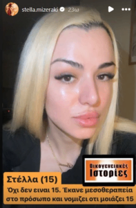 Στη λεζάντα έγραψε: «Στέλλα (15) Όχι δεν είναι 15. Έκανε μεσοθεραπεία και νομίζει ότι μοιάζει με 15», δείχνοντας ότι μπορεί εύκολα να κάνει πλάκα με την εμφάνισή της.