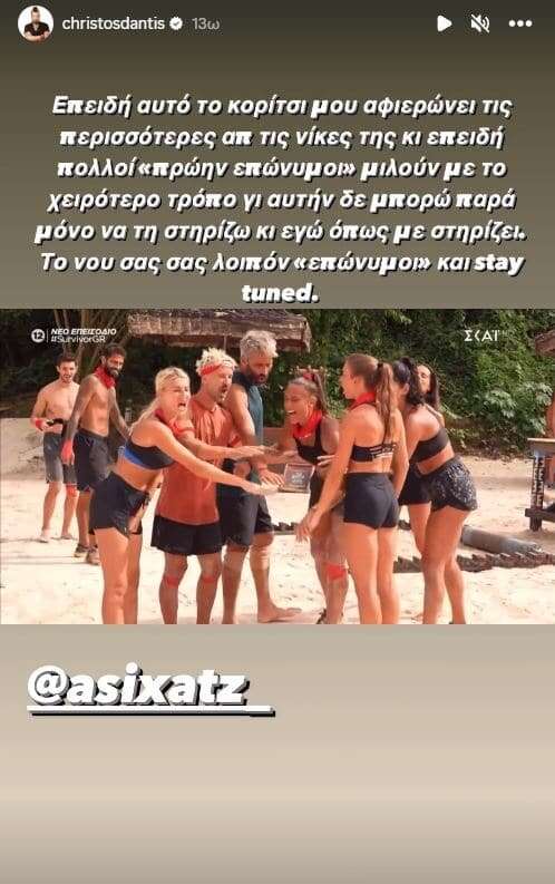 «Επειδή αυτό το κορίτσι μου αφιερώνει τις περισσότερες από τις νίκες της κι επειδή πολλοί “πρώην επώνυμοι” μιλούν με τον χειρότερο τρόπο για αυτήν, δεν μπορώ παρά μόνο να την στηρίζω και εγώ όπως με στηρίζει. Το νου σας λοιπόν “επώνυμοι” και stay tuned», έγραψε χαρακτηριστικά στην ανάρτησή του ο Χρήστος Δάντης.