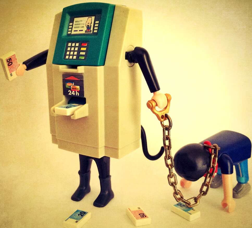 Ο Παπαδόπουλος μίλησε για την ελληνική χρηματοπιστωτική κρίση, με ένα μηχάνημα ΑΤΜ να σέρνει έναν πελάτη τράπεζας μαζί με μια αλυσίδα -ήταν τότε που τα τραπεζικά μηχανήματα μας επέτρεπαν ανάληψη μόνο 60 ευρώ τη φορά.