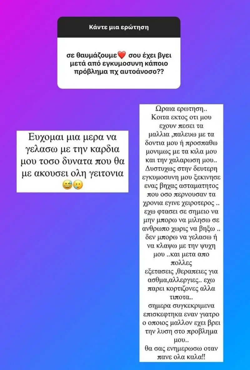 Η πρώην Σταρ Ελλάς αποκάλυψε πως έχει χάσει πολλά από τα μαλλιά της, παλεύει καθημερινά με θέματα στα δόντια της, προσπαθεί να ελέγξει το βάρος της, ενώ η πιο ενοχλητική συνέπεια είναι ένας επίμονος βήχας που ξεκίνησε από τη δεύτερη εγκυμοσύνη και δεν έχει υποχωρήσει μέχρι σήμερα.