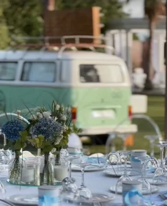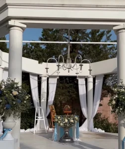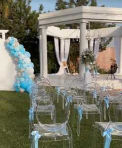 Η κολυμπήθρα στολισμένη με λευκά λουλούδια είχε στηθεί στον υπαίθριο χώρο του κτήματος. Και καρέκλες με τις μπλε κορδέλες είχαν στηθεί στο γκαζόν για τους καλεσμένους.