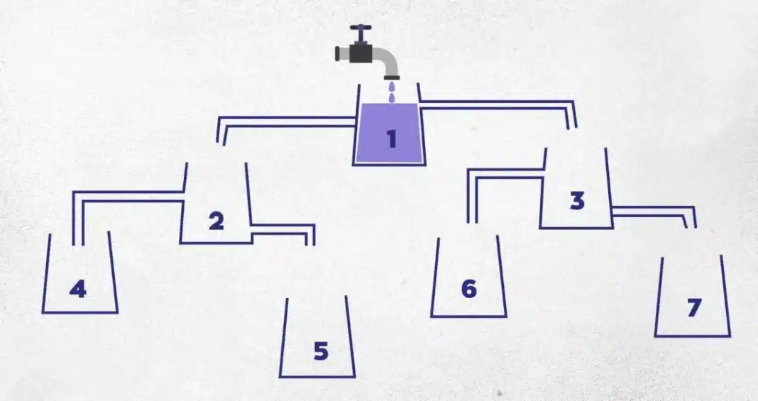 Η παρακάτω εικόνα δείχνει έναν περίπλοκο λαβύρινθο από σωλήνες και δεξαμενές και σας ζητείται να υπολογίσετε ποια δεξαμενή θα γεμίσει πρώτη με νερό. Ωστόσο δεν έχετε πολύ χρόνο. Πρέπει να βρείτε την απάντηση σε μόλις 20 δευτερόλεπτα.