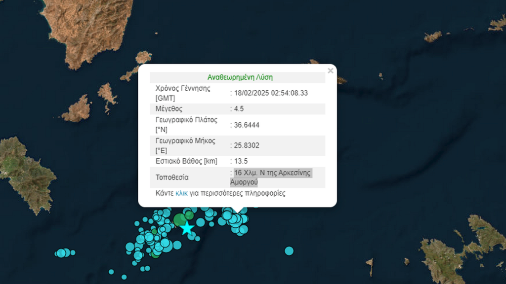Σχετικά με τον σεισμό των 4,5 Ρίχτερ, το επίκεντρο της δόνησης εντοπίζεται στα 13 χλμ. Νότια της Αρκεσίνης Αμοργού, ενώ το εστιακό βάθος υπολογίζεται στα 13,5 χλμ.