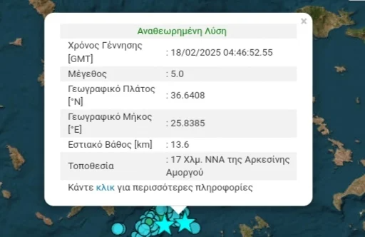 Σχετικά με τον σεισμό των 4,5 Ρίχτερ, το επίκεντρο της δόνησης εντοπίζεται στα 13 χλμ. Νότια της Αρκεσίνης Αμοργού, ενώ το εστιακό βάθος υπολογίζεται στα 13,5 χλμ.
