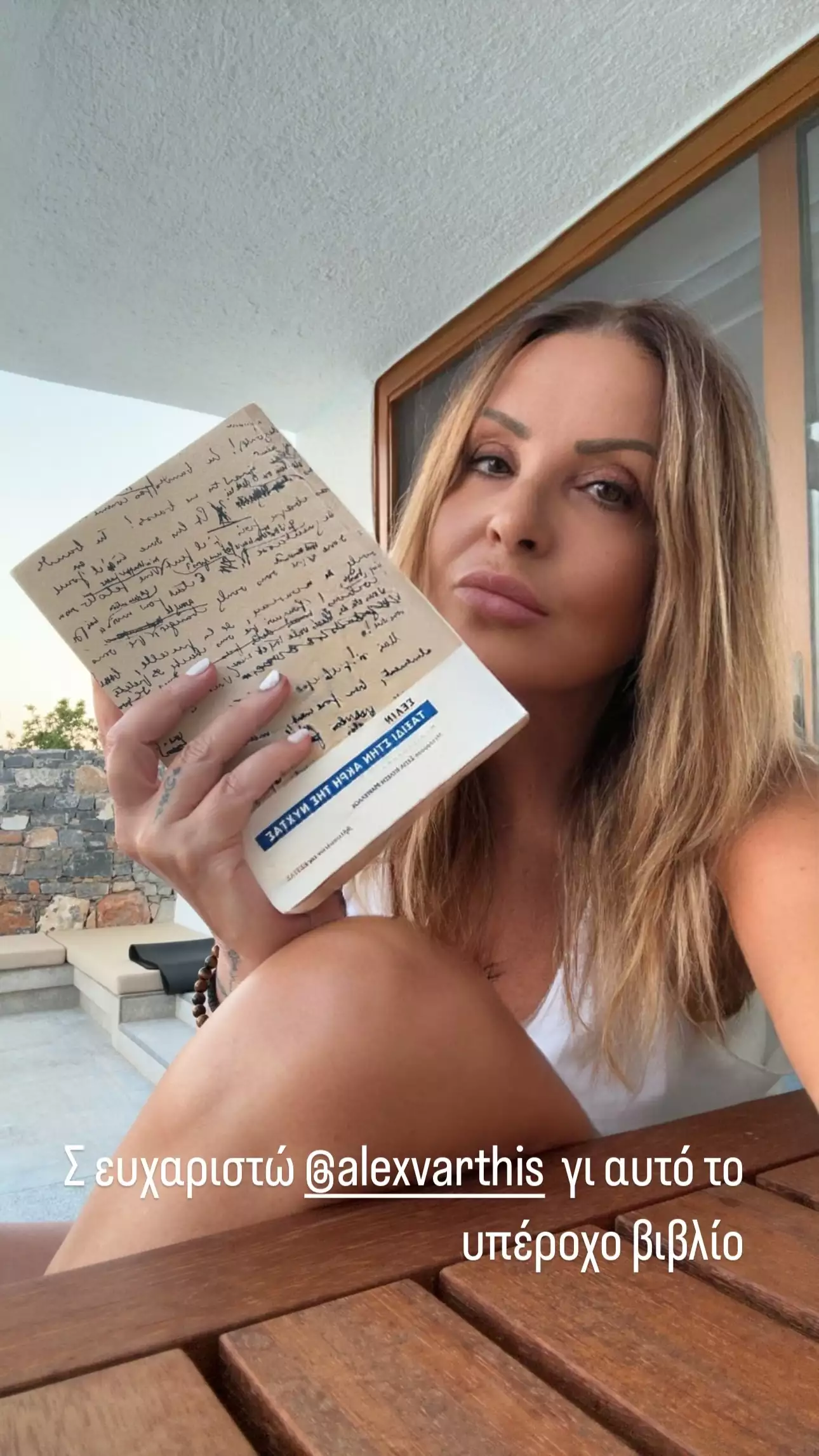 Αυτή τη φορά, η Ναταλία Γερμανού θέλοντας να ευχαριστήσει τον ηθοποιό Αλέξανδρο Βάρθη για το βιβλίο που της έκανε δώρο με τίτλο «Ταξίδι στην άκρη της νύχτας», δημοσίευσε μια φωτογραφία αγκαλιά με αυτό ποζάροντας χωρίς ίχνος μακιγιάζ.