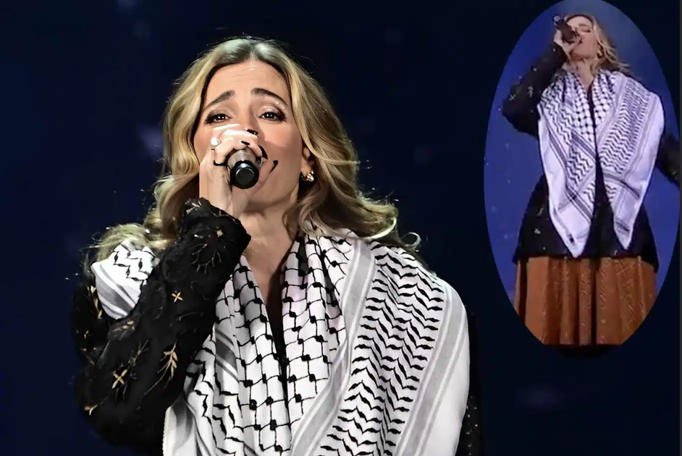 Η γνωστή τραγουδίστρια που συχνά τοποθετείται πολιτικά, εμφανίστηκε μάλιστα επί σκηνής με την κεφίγια, την παλαιστινιακή μαντίλα στους ώμους της, θέλοντας με αυτόν τον τρόπο να εκφράσει τη συμπαράστασή της στον λαό της Παλαιστίνης, για τον πόλεμο στη Γάζα.