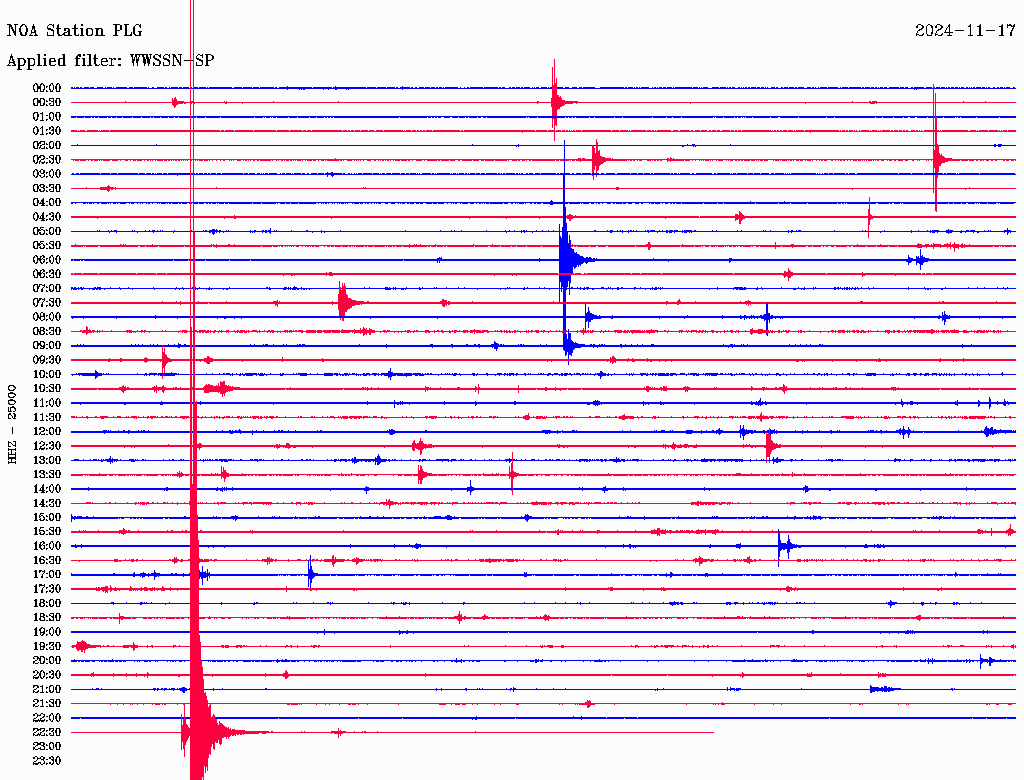 Δείτε στη gallery το σεισμό, όπως τον κατέγραψε ο σεισμογράφος του Σεισμολογικού Δικτύου του Γεωδυναμικού Ινστιτούτου του Εθνικού Αστεροσκοπείου Αθηνών, που είναι τοποθετημένος στον Πολύγυρο Χαλκιδικής.